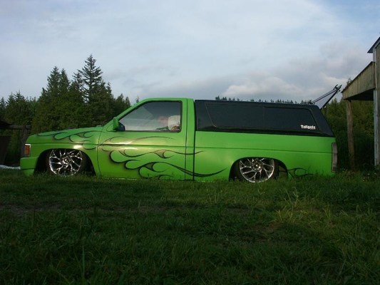 3"Body drop, shaved gas door, emblem, antenna, hood squirters,cowl, door handles and 3rd brake light, frenched plate box in tailgate skin, roll pan, 92 Toyota bumper w/plate box & shaved signals W/96 Tacoma valance, Clear Tail lights, Leer shell W/Blazer