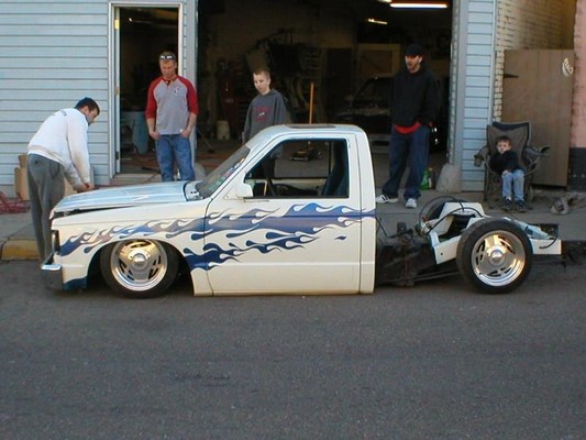 this truck was previously body droped by an old club member know as deez nutz member and the truck was all crooked and didnt line up and jay and eric from down 2 earth customs had to redo the whole thing