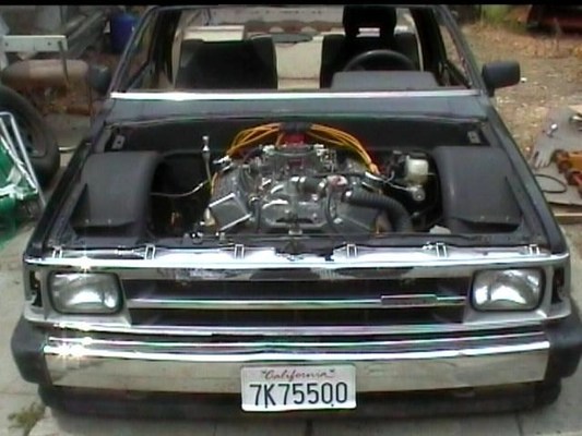 383 (440 hp @5000 rpm at the rear wheels when last dynoed 440 ft pound of torque at around 3700 rpm)bored .030 over , edelbrock 800 cfm carb air gap manifold ,rpm cam ,aluminum heads,JE forged pistons (10.3:1 compression ratio),6" h-beam rods.forged strok