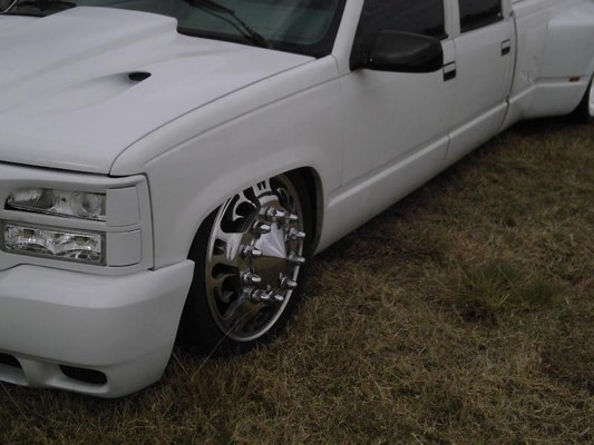 American auto Designs custom cowl hood, cateye grill shaved down to fit the 99 escalade front bumper. Shaved tailgate and molded and welded in roll pan. Rear fenders were extended to fit the 22s.